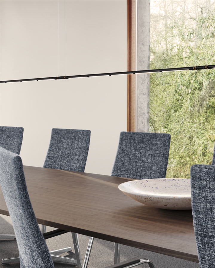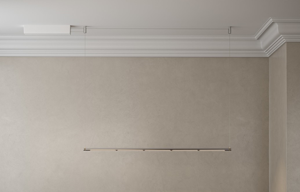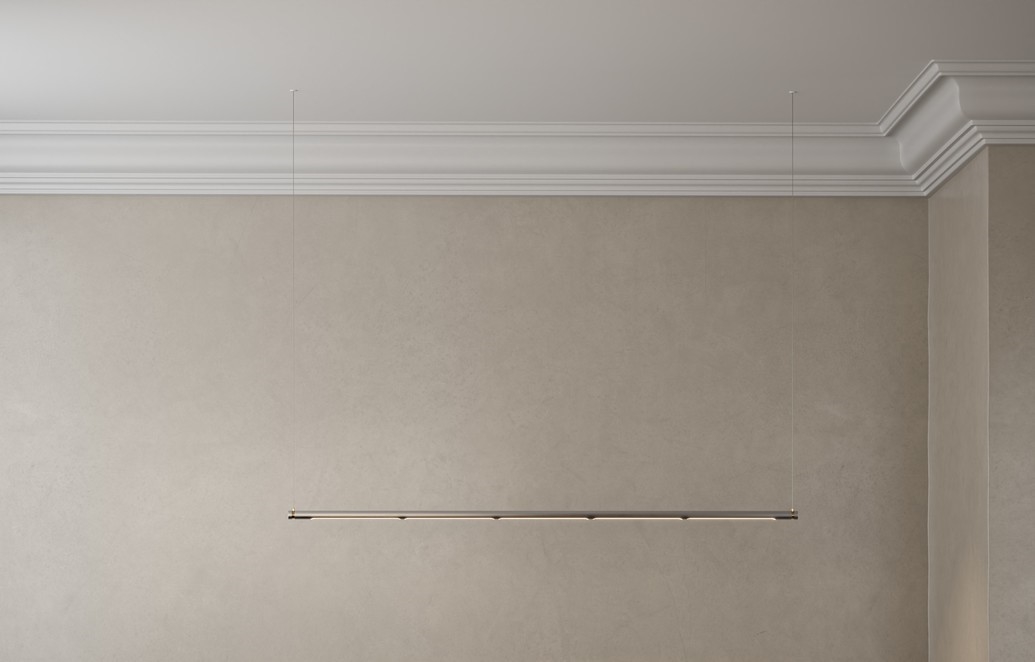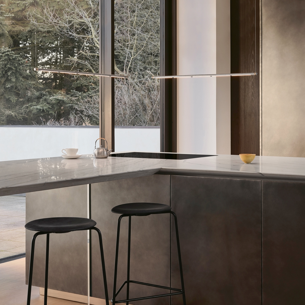 Oneline is geïnspireerd door de zuivere vormen in het meubeldesign van Poul Kjærholm. De unieke hanglamp is verkrijgbaar in roestvrij staal, geborsteld messing of in zwart PVD. De lamp en lichtbron kunnen 360 graden draaien en lijken, met hun stroomvoerende draden, draadloos en zwevend in de lucht.