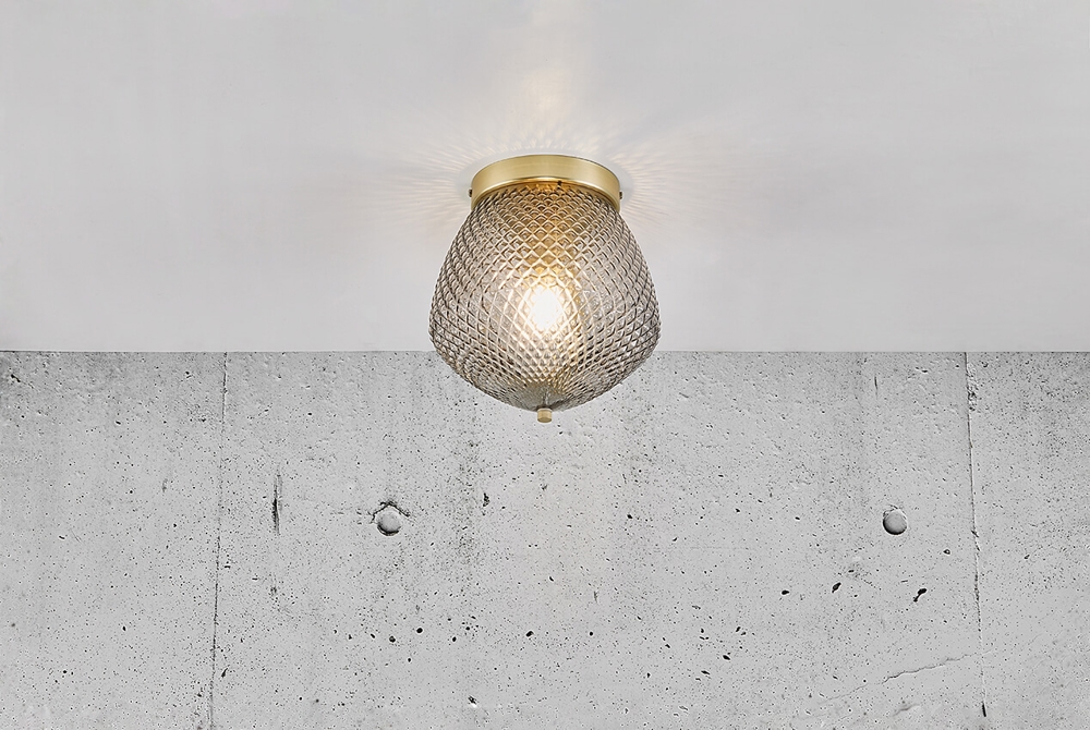 Orbiform plafondlamp bestaat uit een mix van messing en gerookt glas. Het glas heeft een diamanten patroon, wat het licht op verschillende manieren in de ruimte reflecteert.