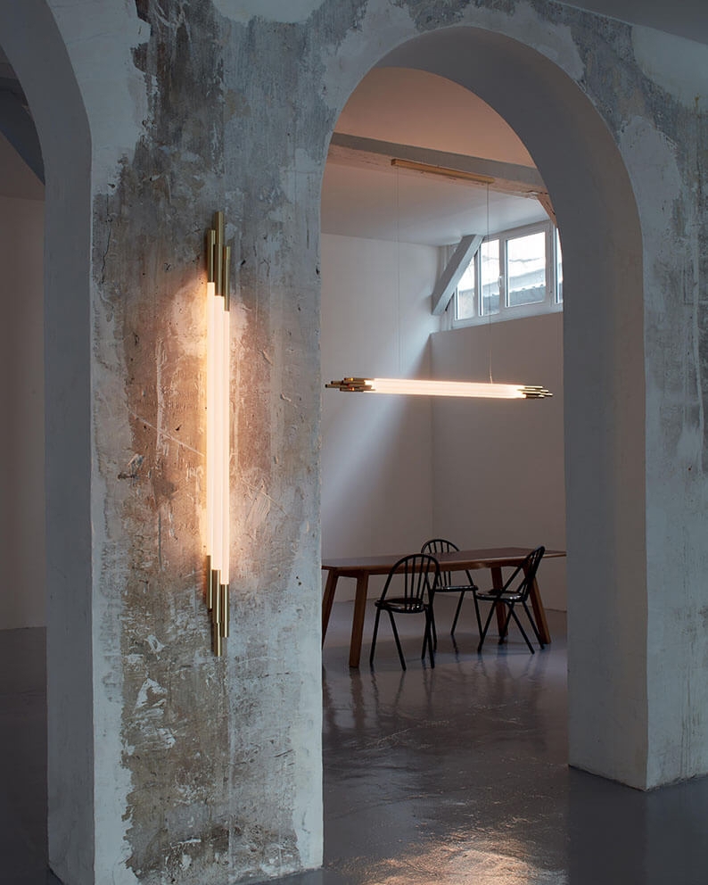 Het ontwerp van de wandlamp Org 1500 is geïnspireerd door sciencefiction en astronomie met een verwijzing naar een vallende ster. De elegante wandlamp is gemaakt van geanodiseerd aluminium met een goudafwerking en heeft kappen van opaalglas. Hij kan zowel horizontaal als verticaal worden gemonteerd en is een verfijnde toevoeging aan vele interieurs.