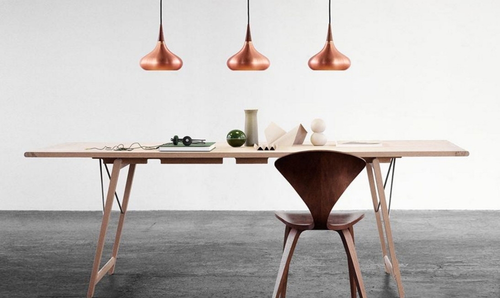 De klassieke hanglamp herleeft volledig trouw aan het origineel in twee maten Ø225 en Ø340 mm. De organische vormtaal verenigt prachtig de diepe levendige kopergloed met de top in rozenhout. Vanuit de donkere aderen van het rozenhout ontstaat een natuurlijke verbinding met het zwarte, dicht geweven textielsnoer. De lamp heeft 21/24 smalle, verticale sleuven in de top van de echte koperen kap, die licht doorlaten. Het armatuur verbergt elegant de lichtbron en zorgt voor een aangenaam zacht licht zonder verblinding.