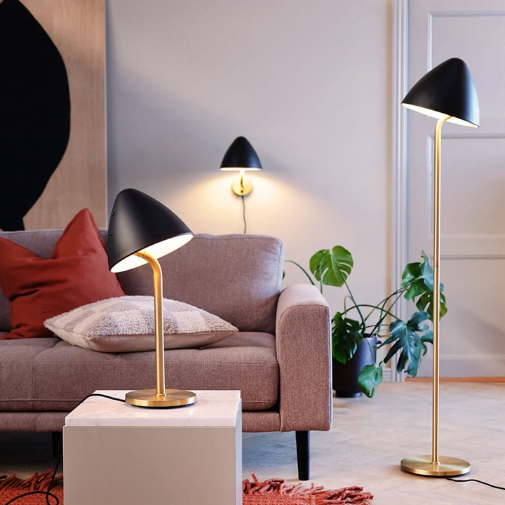 Oulu is verkrijgbaar als wandlamp, vloerlamp en tafellamp in de combinaties zwart/messing en zwart/geborsteld staal.