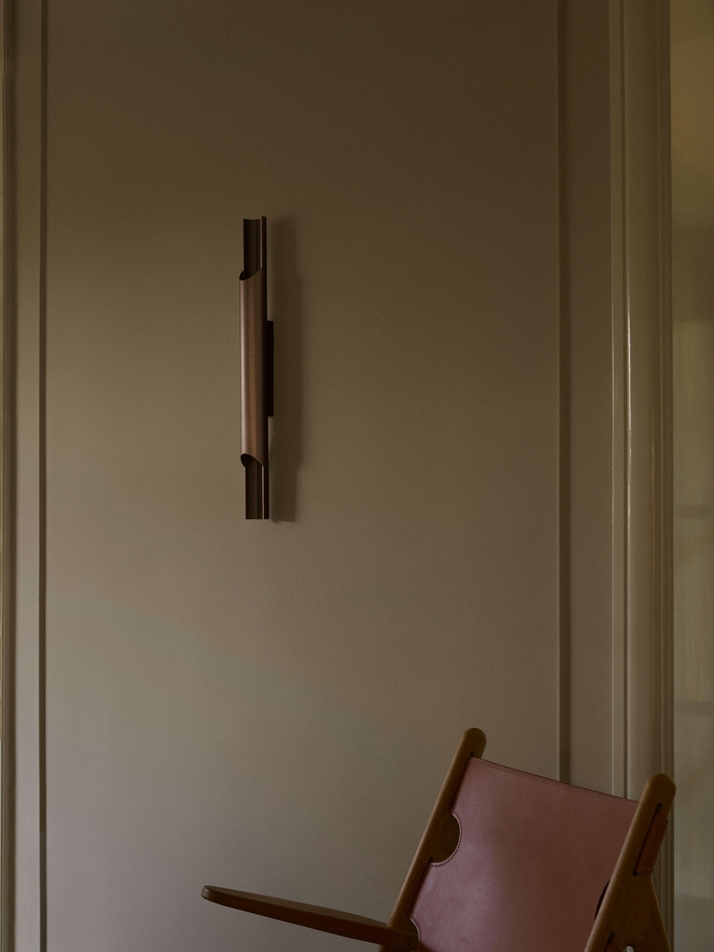 De wandlamp Pan 50 is een prachtig en decoratief ontwerp van Bent Karlby, geïnspireerd door de panfluit. De lamp creëert een mooi lichtspel op de muur via de openingen aan de boven- en onderkant van de glanzende lichtbuis in geanodiseerd aluminium met bronsafwerking. De twee lichtbronnen zorgen voor een gelijkmatig zacht licht van boven en onder.