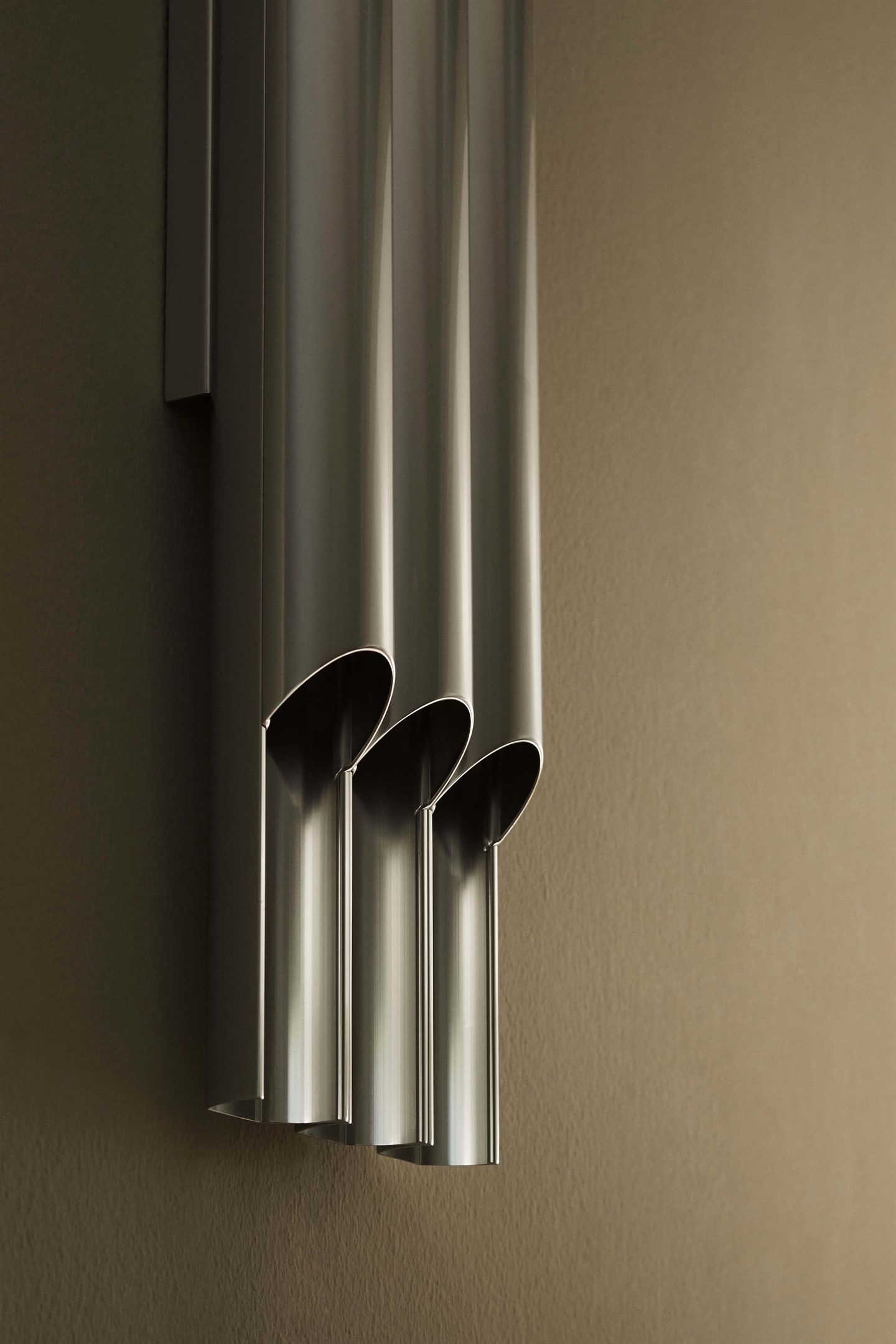De wandlamp Pan 50 III is een prachtig en decoratief ontwerp van Bent Karlby, geïnspireerd door de panfluit. De lamp creëert een mooi lichtspel op de muur via de openingen aan de boven- en onderkant van de drie glanzende lichtbuizen in geanodiseerd aluminium met bronsafwerking. De twee lichtbronnen in elke lichtbuis zorgen voor een gelijkmatig zacht licht van boven en onder.