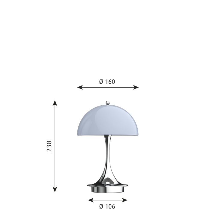 Panthella 160 Portable wordt geleverd met USB-kabel, maar ZONDER USB-adapter, die apart kan worden aangeschaft. Daarnaast is Panthella V2 compatibel met standaard USB-adapters (min. 1,5 A) en draadloze QI-opladers.