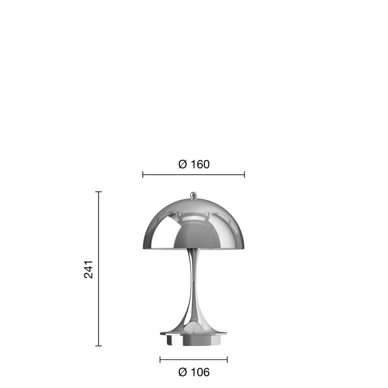Deze Panthella is hoogglans verchroomd. Het is het V3-model van de Panthella 160 Portable, dat in 2024 is gelanceerd. In vergelijking met eerdere modellen is het V3-model onder andere verbeterd met een langere batterijduur en heeft het de lichtregeling ingebouwd in de knop bovenop de kap, waar de dim- en aan/uit-functie eerder op de basis zaten.