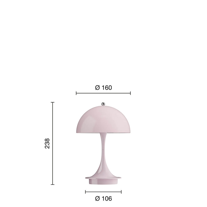 Deze Panthella heeft een basis en opaal kap in lichtroze. Het is het V3-model van de Panthella 160 Portable, gelanceerd in 2024. In vergelijking met eerdere modellen is het V3-model onder andere verbeterd met een langere batterijduur en heeft het de lichtregeling ingebouwd in de knop bovenop de kap, waar de dim- en aan/uit-functie eerder op de basis zaten.
