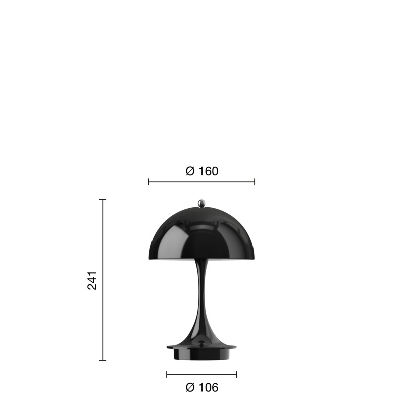 Panthella 160 Portable is batterijgevoed met een oplaadindicator op de basis en wordt eenvoudig opgeladen met de meegeleverde USB-kabel. Hij is dimbaar in drie stappen met een helderheid van 100%, 33% en 10% en kan respectievelijk 8,5 uur, 25,5 uur en 79 uur branden voordat hij opnieuw moet worden opgeladen. Een volledige oplading duurt 5 uur. De tafellamp is een ongelooflijk veelzijdige batterijlamp die overal mee naartoe kan worden genomen en zowel binnen als buiten kan worden gebruikt als terraslamp of op het balkon.