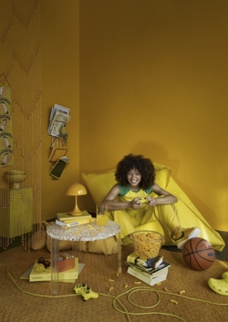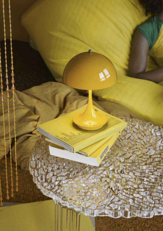 Deze Panthella heeft een basis en ondoorzichtige kap in geel. Het is het V3-model van Panthella 160 Portable, dat in 2024 is gelanceerd. In vergelijking met eerdere modellen is het V3-model onder andere verbeterd met een langere batterijduur en heeft het de lichtregeling ingebouwd in de knop bovenop de kap, waar de dim- en aan/uit-functie eerder op de basis zaten.