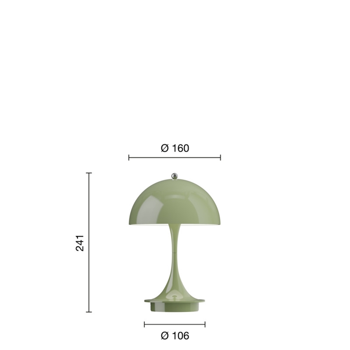 Deze Panthella heeft een basis en ondoorzichtige kap in groen. Het is het V3-model van de Panthella 160 Portable, en deze kleurvariant is gelanceerd in 2025. In vergelijking met eerdere modellen is het V3-model onder andere verbeterd met een langere batterijduur en heeft de lichtregeling ingebouwd in de knop bovenop de kap, waar de dim- en aan/uit-functie eerder op de basis zat.