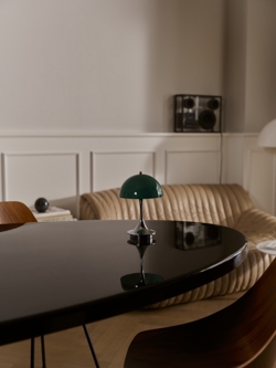 De iconische Panthella lamp werd ontworpen in 1971. De lamp is een klassiek voorbeeld van hoe Panton gevoel had voor aangename verlichting en voor een tijdloos en opvallend design dat in elke inrichting past. Deze oplaadbare variant met opaal kap in de originele groene Panthella-kleur uit de jaren '70 is geïntroduceerd in 2026 ter gelegenheid van de 100e verjaardag van Verner Panton.