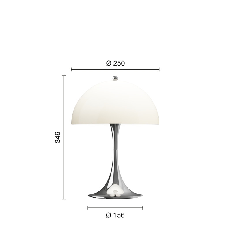 Deze Panthella heeft een basis in chroom en een kap in beige opaal. Het is het V3-model van Panthella 250 Portable, dat in 2025 is gelanceerd. In vergelijking met eerdere modellen is het V3-model onder andere verbeterd met een langere batterijduur en een functie die de batterij beschermt als je de lamp gebruikt terwijl deze op het stopcontact is aangesloten. Bovendien heeft het nieuwe model de aan/uit-functie ingebouwd in de knop bovenop de kap, waar deze voorheen op de basis zat.