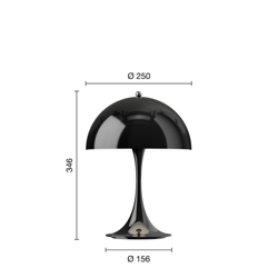 Deze Panthella heeft een basis en ondoorzichtige kap in zwart. Het is het V3-model van Panthella 250 Portable, dat in 2025 is gelanceerd. In vergelijking met eerdere modellen is het V3-model onder andere verbeterd met een langere batterijduur en een functie die de batterij beschermt als je de lamp gebruikt terwijl deze op het stopcontact is aangesloten. Bovendien heeft het nieuwe model de aan/uit-functie ingebouwd in de knop bovenop de kap, waar deze voorheen op de basis zat.