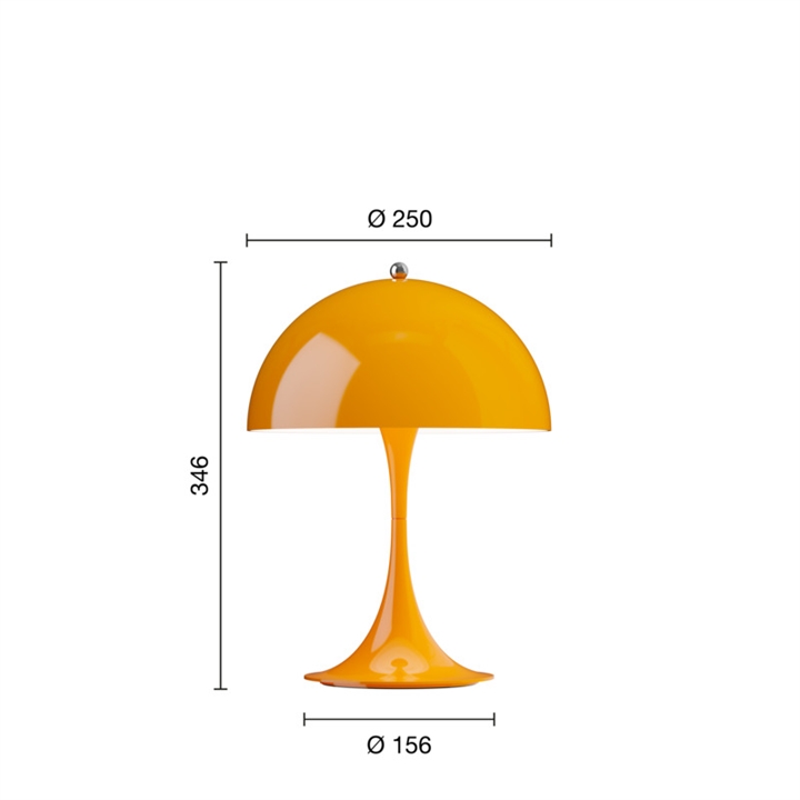 Deze Panthella heeft een basis en ondoorzichtige kap in oranje. Het is het V3-model van Panthella 250 Portable, dat in 2025 wordt gelanceerd. In vergelijking met eerdere modellen is het V3-model onder andere verbeterd met een langere batterijduur en een functie die de batterij beschermt als je de lamp gebruikt terwijl deze op het stopcontact is aangesloten. Bovendien heeft het nieuwe model de aan/uit-functie ingebouwd in de knop bovenop de kap, waar deze voorheen op de basis zat.
