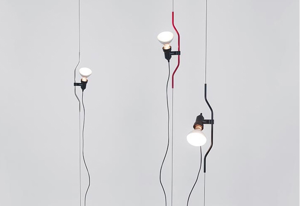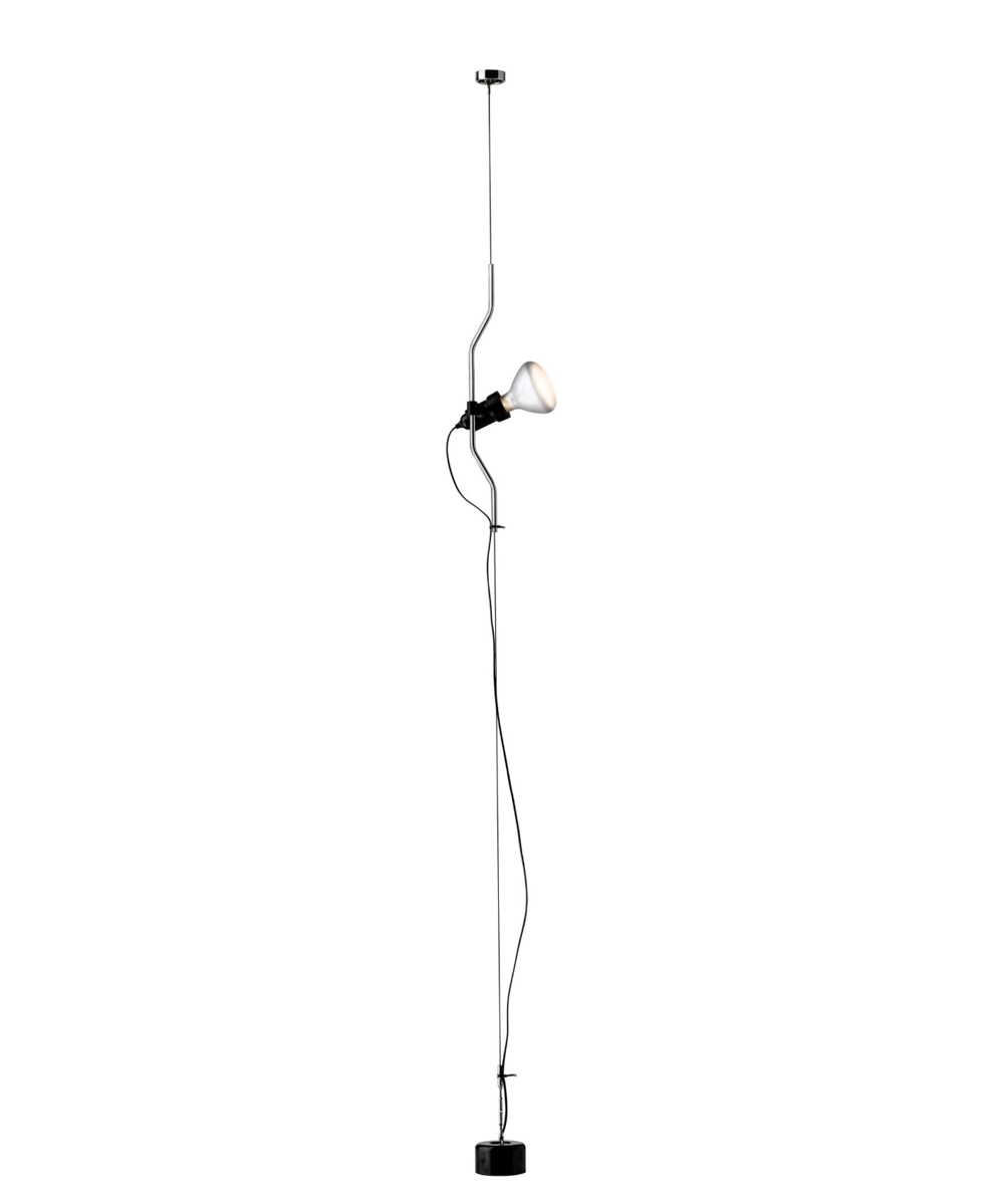 Parentesi is een unieke vloer-tot-plafondlamp, waarbij de lamp zelf is gemonteerd op een 4 m lange staalkabel.