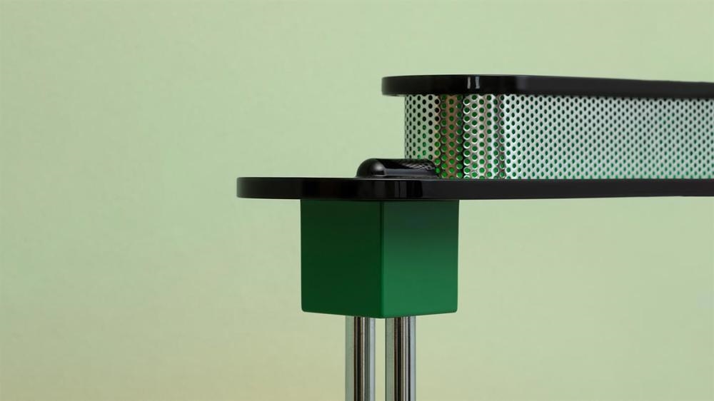 Pausania heeft een mooie groene kap, zwarte basis en verchroomd frame.