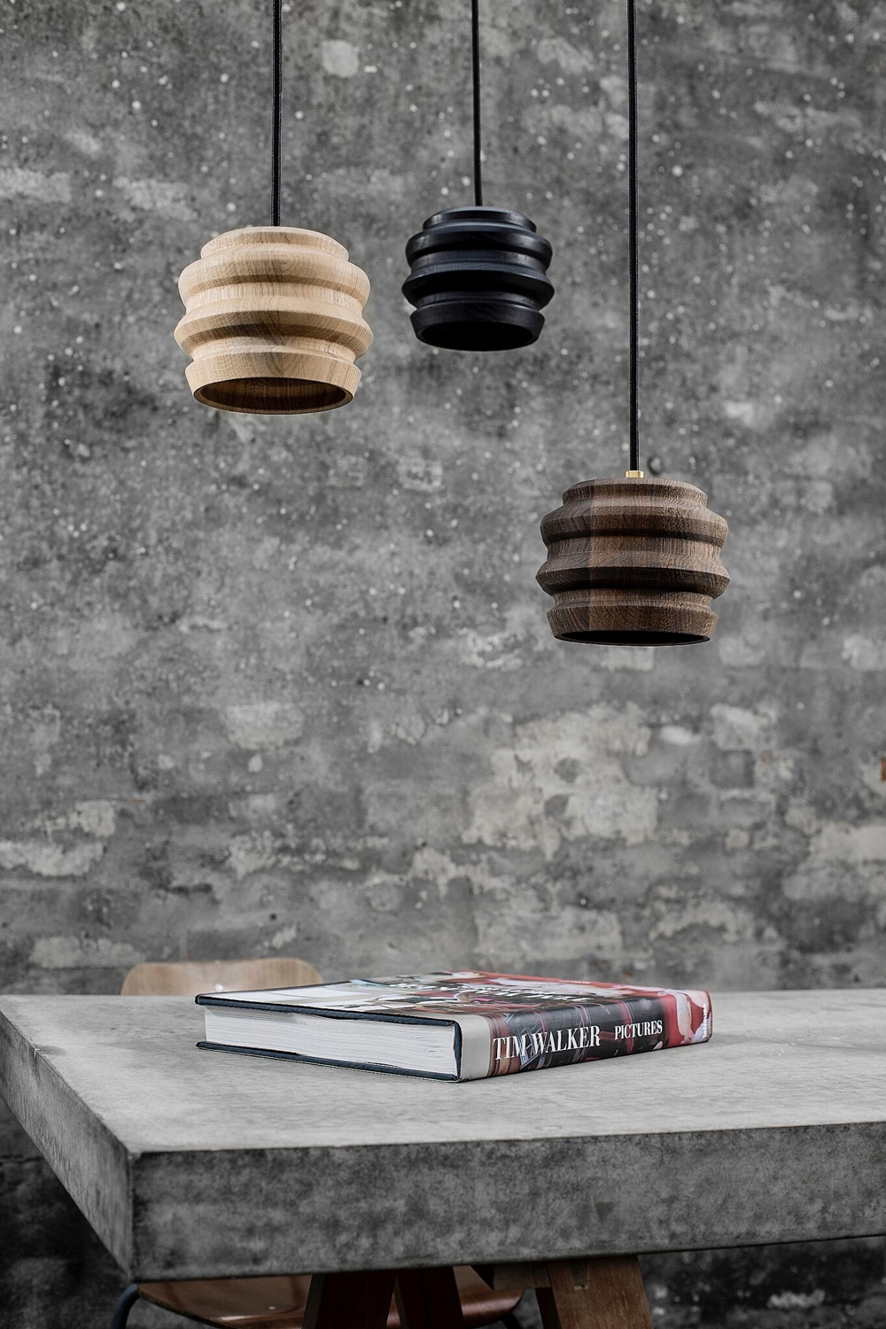 Gedraaid massief eikenhout in drie varianten, trekontlasting in geborsteld messing en een zwart met textiel beklede siliconen kabel.