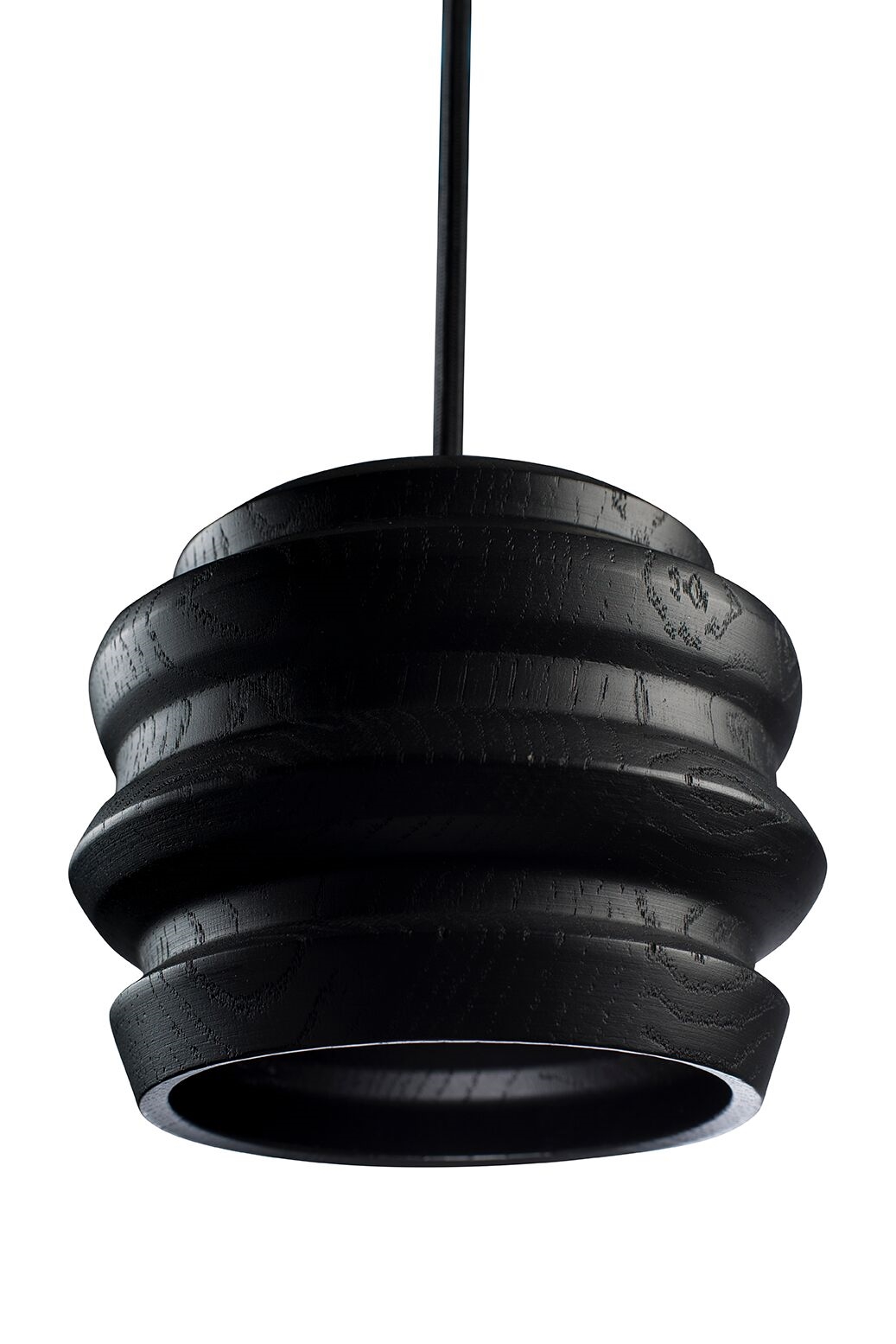 Gedraaid massief eikenhout in drie varianten, trekontlasting in geborsteld messing en een zwart met textiel beklede siliconen kabel.
