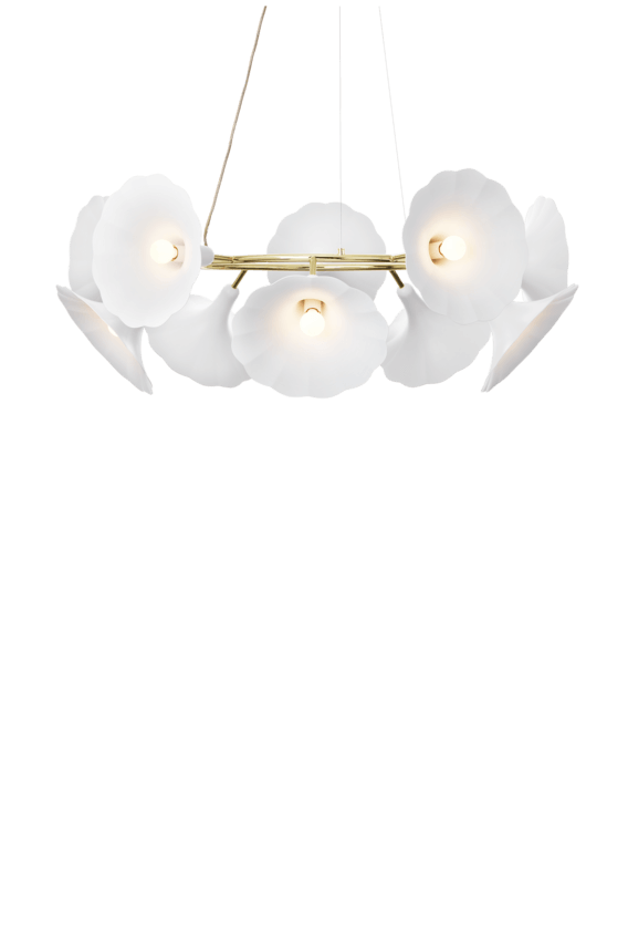 Petalii is verkrijgbaar als hanglamp, kroonluchter en als vloerlamp.