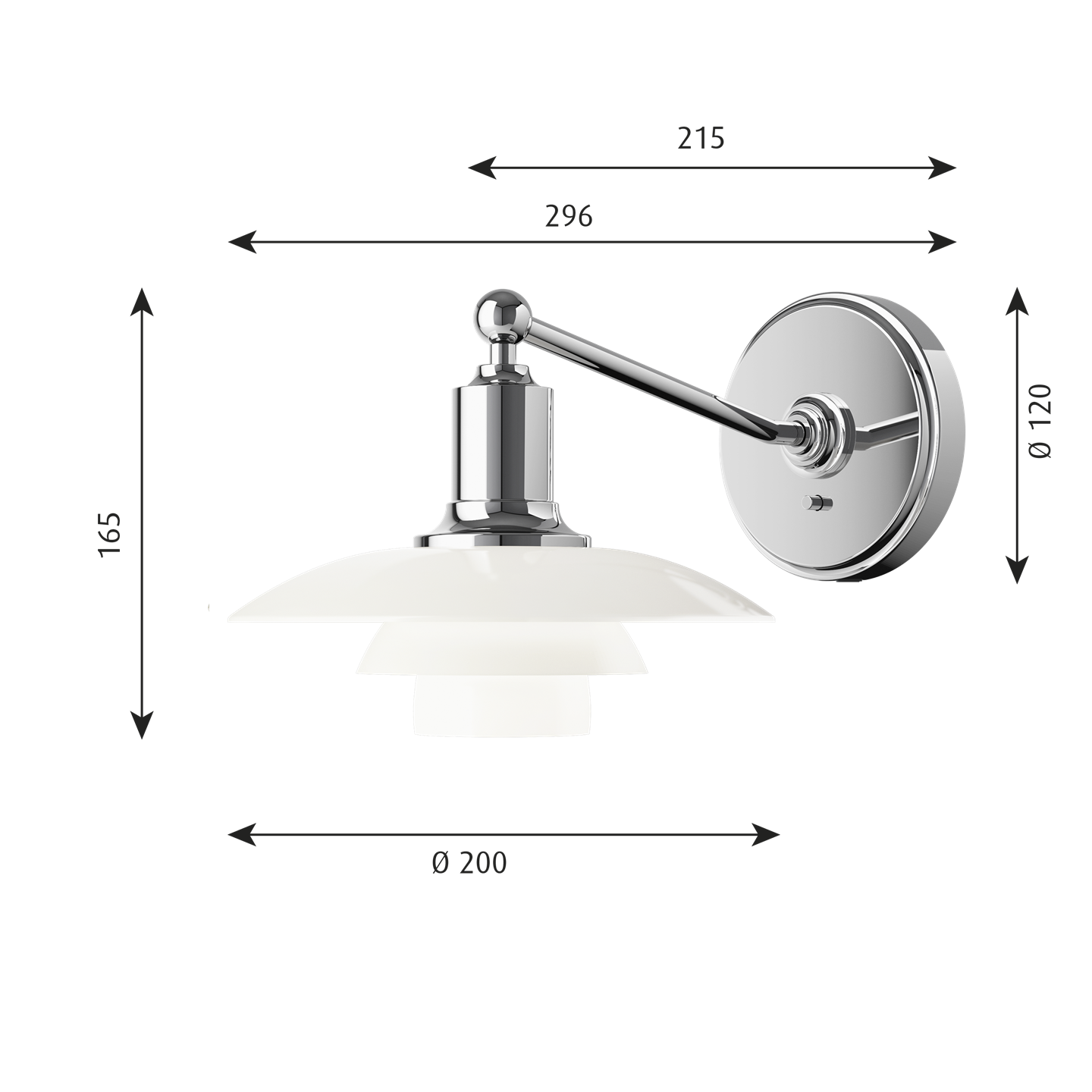 De arm van de PH 2/1 wandlamp is van hoogglans verchroomd messing, en de bevestiging is van hoogglans verchroomd getrokken messing.