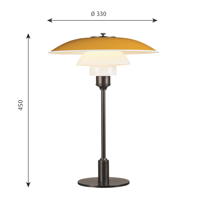Het PH-lampnummer verwijst naar de grootte van de lampenkappen. Daarom bestaat de PH 3½-2½ tafellamp uit een bovenkap van ca. 35 cm en onderkappen van de 2½ versie.