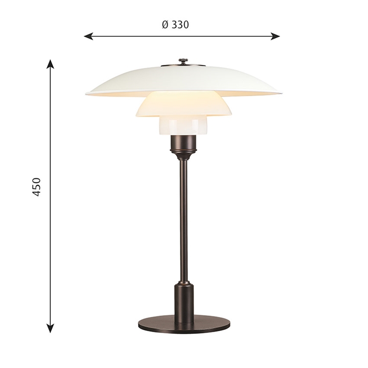 Het PH-lampnummer verwijst naar de grootte van de lampenkappen. Daarom bestaat de PH 3½-2½ tafellamp uit een bovenkap van ca. 35 cm en onderkappen van de 2½ versie.