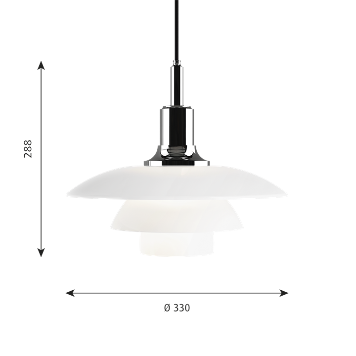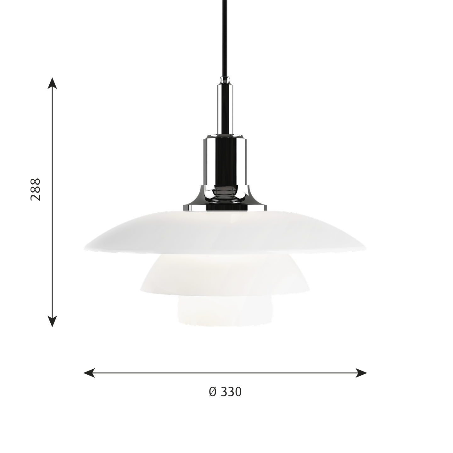 Het PH-lampnummer verwijst naar de grootte van de lampenkappen. Daarom bestaat de PH 3½-3 hanglamp uit een bovenkap van ca. 35 cm en onderkappen van de 3/3 versie.