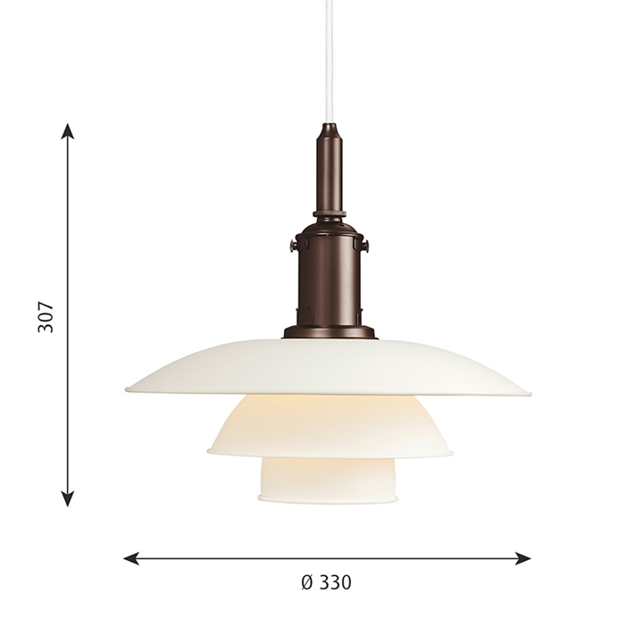 Het PH-lampnummer verwijst naar de grootte van de lampenkappen. Daarom bestaat de PH 3½-3 hanglamp uit een bovenscherm van ca. 35 cm en onderschermen van de 3/3 versie.