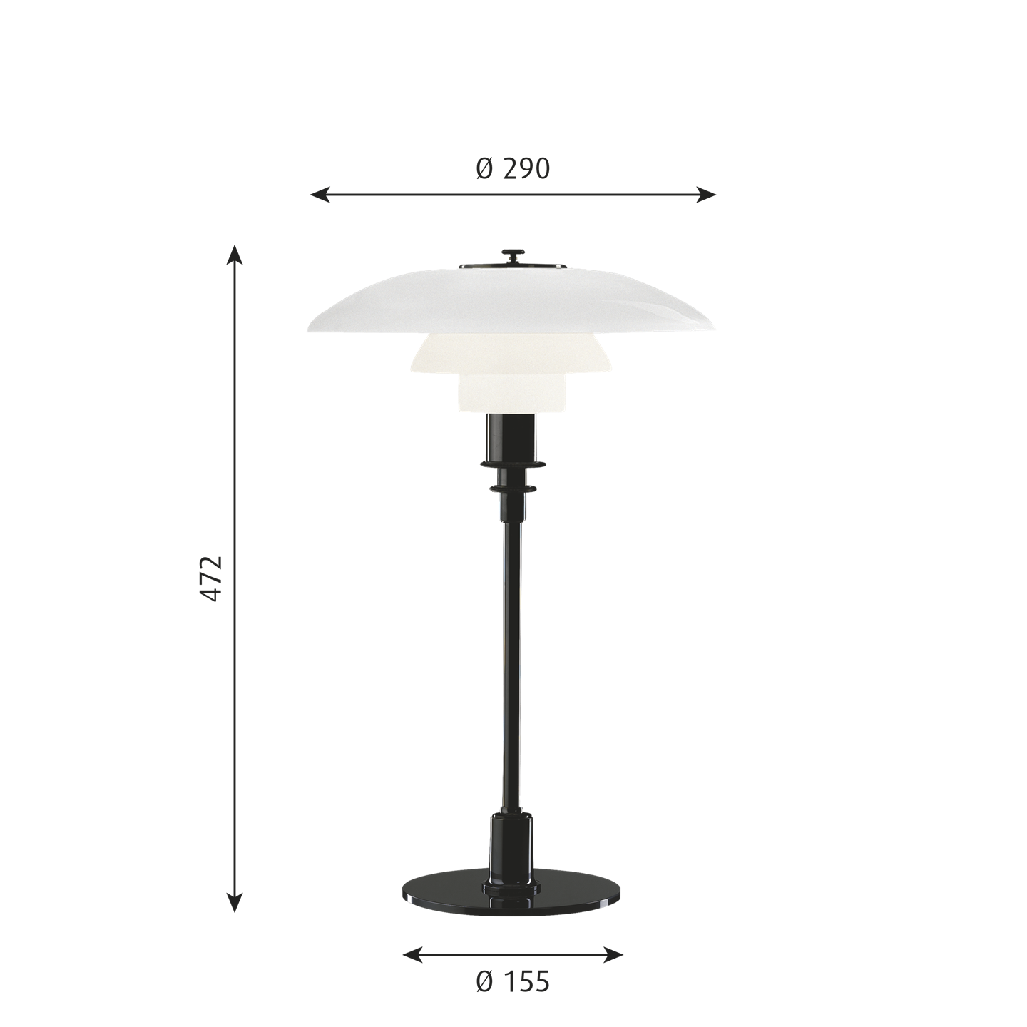 Het PH-lampnummer verwijst naar de grootte van de lampenkappen. Daarom bestaat de PH 3/2 tafellamp uit een bovenkap van ca. 30 cm en onderkappen van de 2/2-versie.