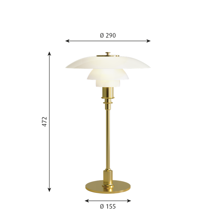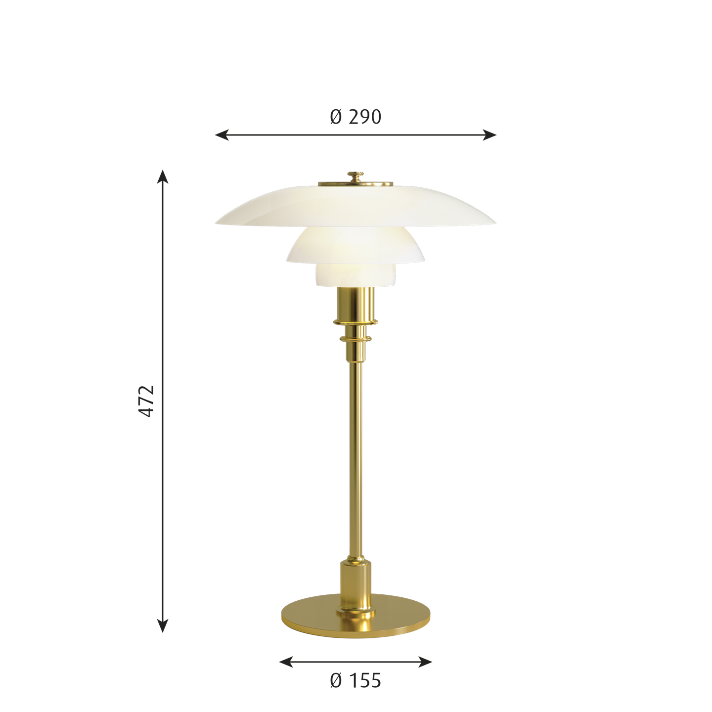 Het PH-lampnummer verwijst naar de grootte van de lampenkappen. Daarom bestaat de PH 3/2 tafellamp uit een bovenkap van ca. 30 cm en onderkappen van de 2/2-versie.