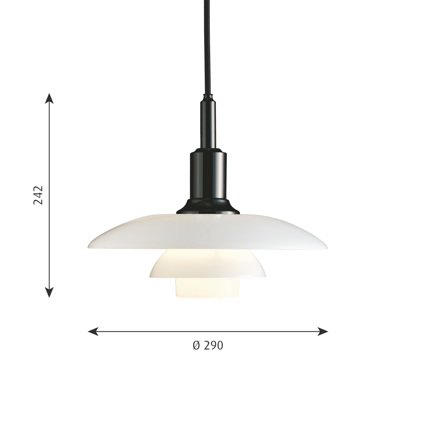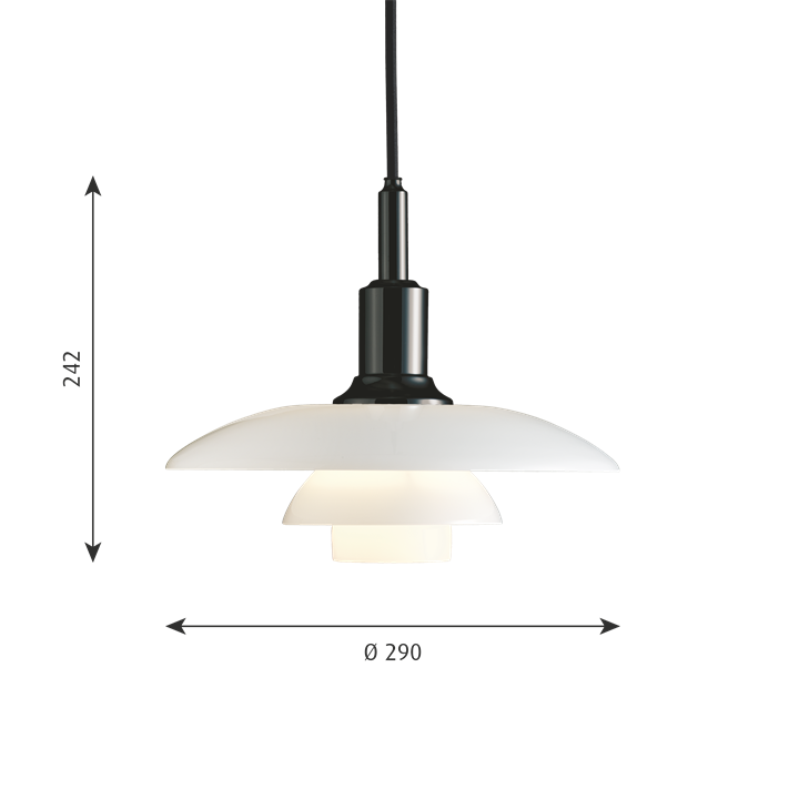 Het PH-lampnummer verwijst naar de grootte van de lampenkappen. Daarom bestaat de PH 3/2 hanglamp uit een bovenkap van ca. 30 cm en onderkappen van de 2/2-versie.
