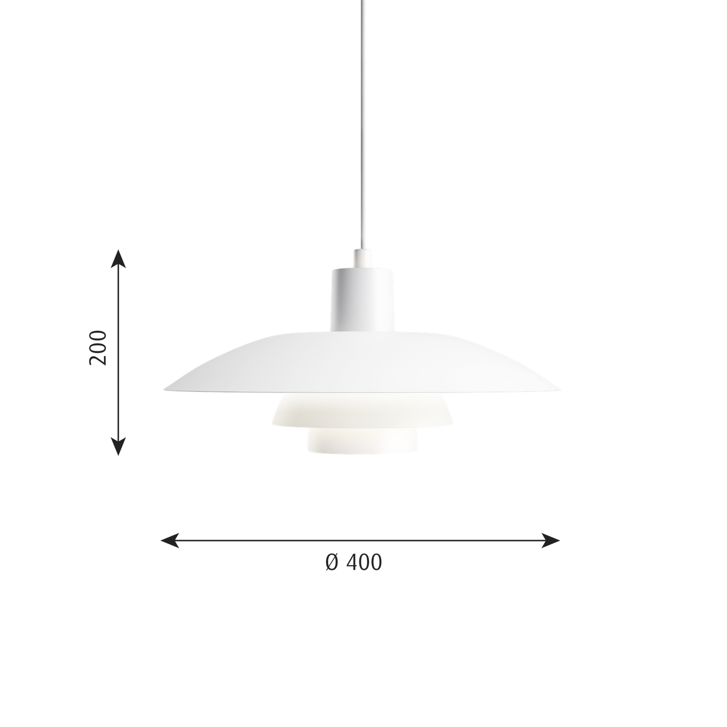 Het PH-lampnummer verwijst naar de grootte van de lampenkappen. Daarom bestaat de hanglamp uit een bovenscherm van ca. 40 cm en onderschermen van de 3/3-versie.