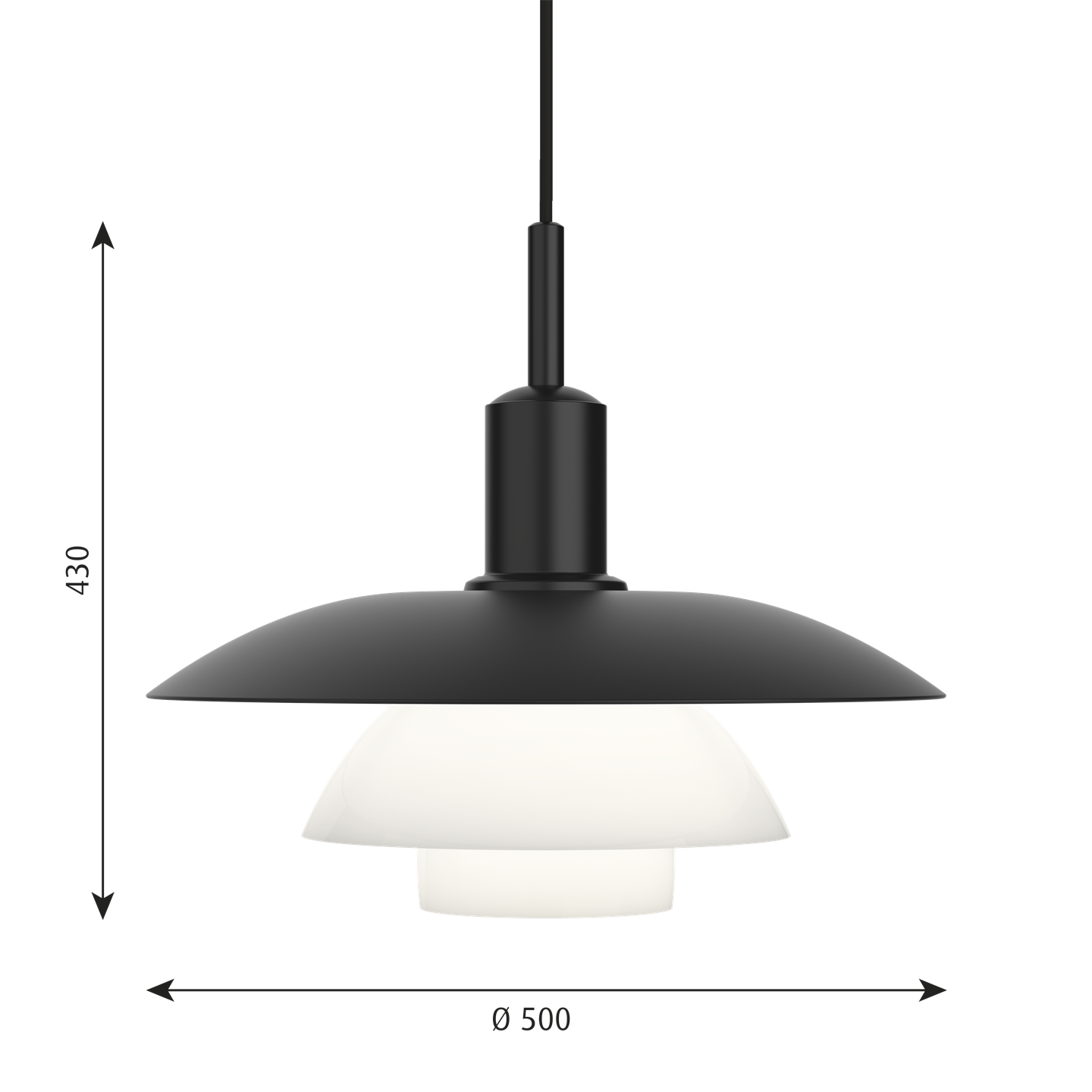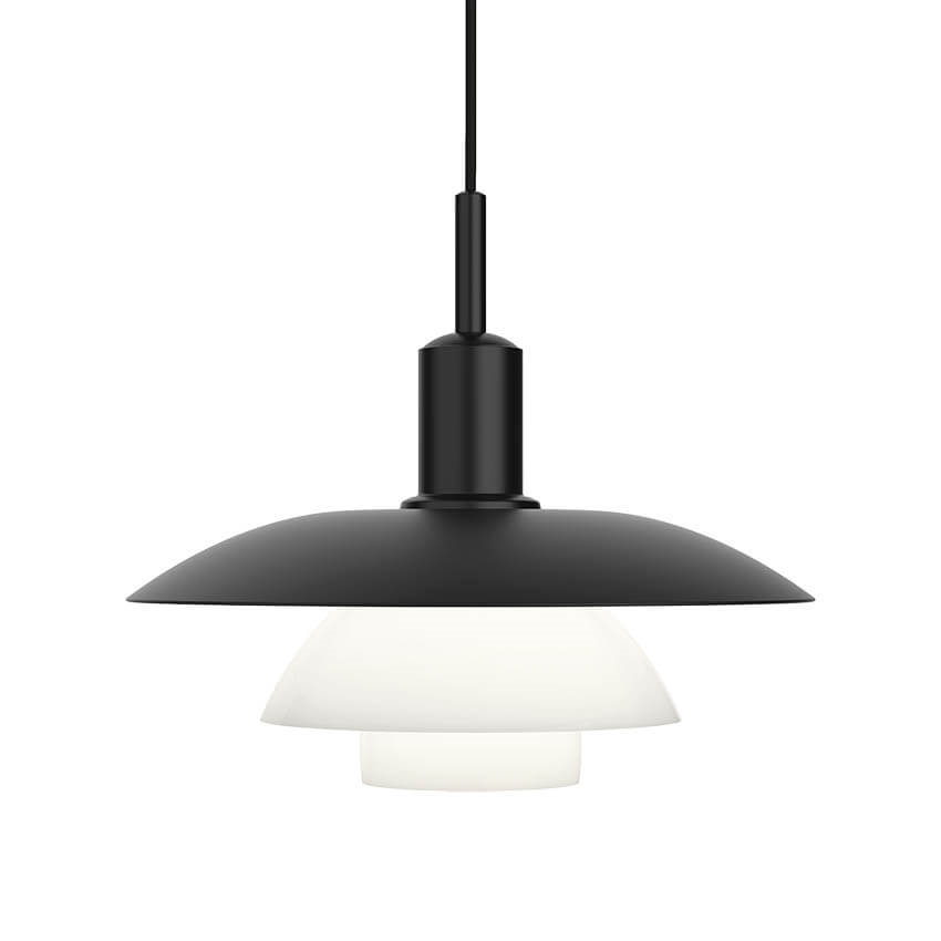 De unieke PH 5/5 hanglamp geeft een zacht en harmonieus licht van de ene matzwarte gelakte en de twee opale glasschermen, die drie lagen vormen en het licht voornamelijk naar beneden leiden.