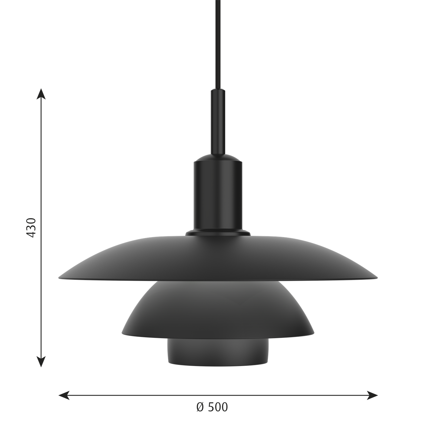 De unieke PH 5/5 hanglamp geeft een zacht en harmonieus licht van de mat zwarte gelakte schermen in drie lagen, die het licht voornamelijk naar beneden richten.