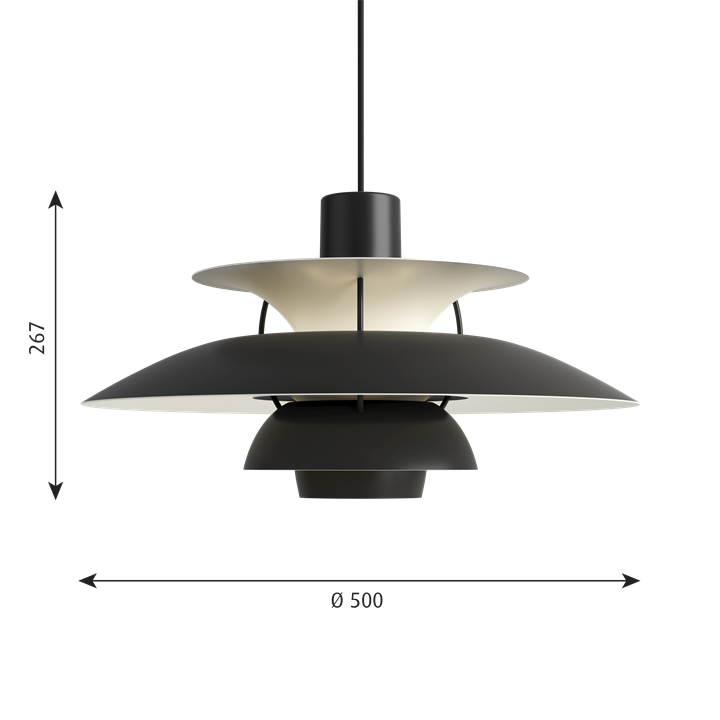 Het PH-lampnummer verwijst naar de grootte van de lampenkappen. Daarom bestaat de PH 5 hanglamp uit een bovenscherm van ca. Ø50 cm.