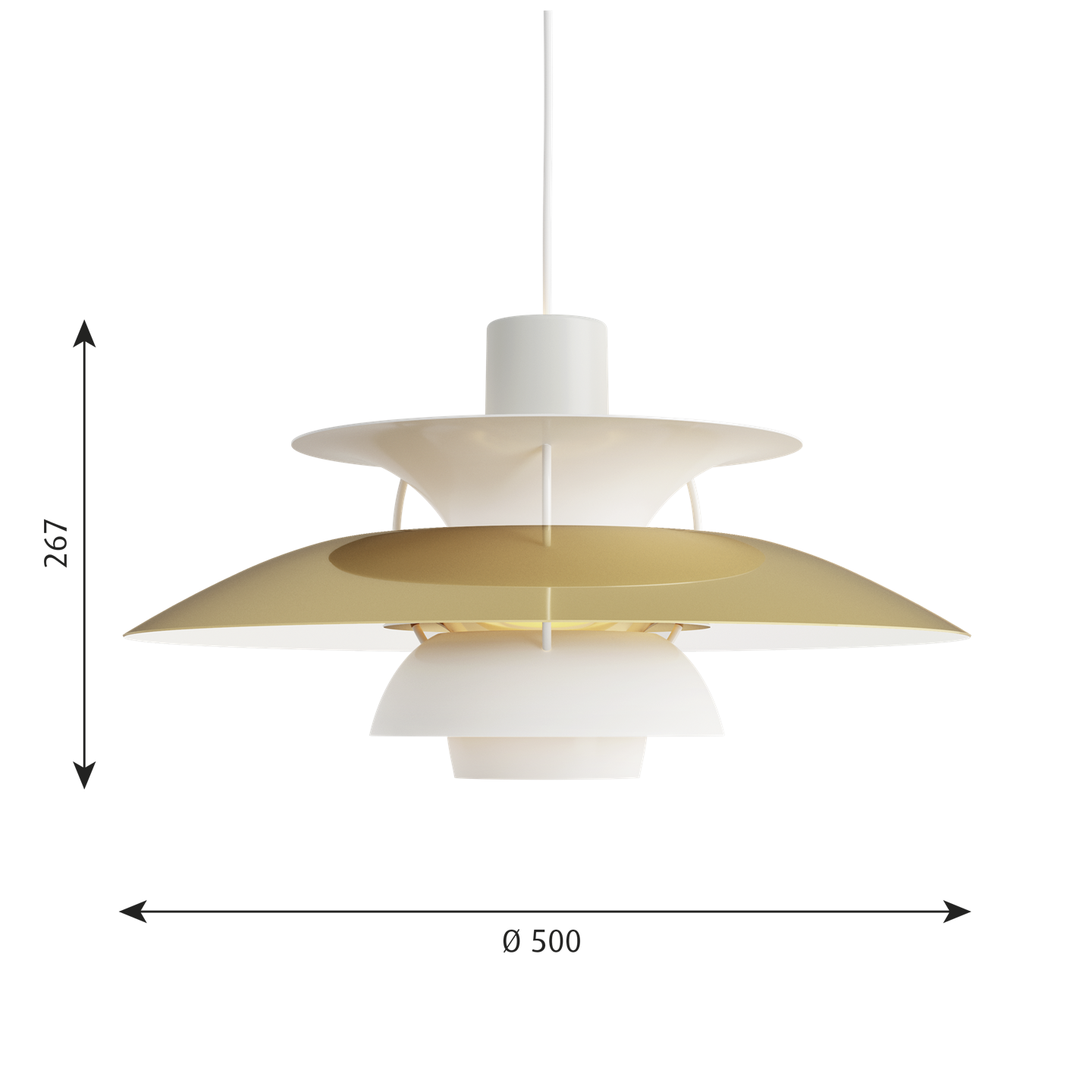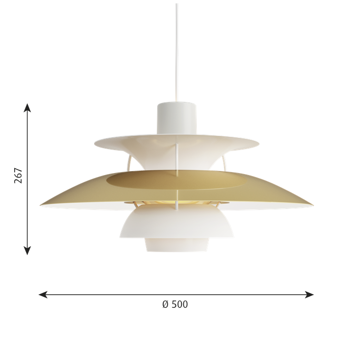 Het PH-lampnummer verwijst naar de grootte van de lampenkappen. Daarom bestaat de PH 5 hanglamp uit een bovenscherm van ca. Ø50 cm.
