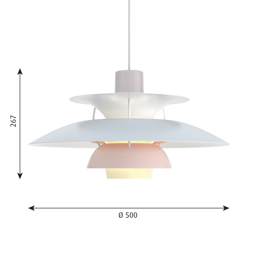 Het PH-lampnummer verwijst naar de grootte van de lampenkappen. Daarom bestaat de PH 5 hanglamp uit een bovenkap van ca. Ø50 cm.