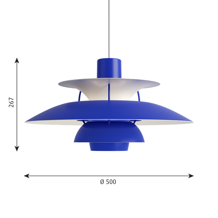 Het PH-lampnummer verwijst naar de grootte van de lampenkappen. Daarom bestaat de PH 5 hanglamp uit een bovenscherm van ca. Ø50 cm.