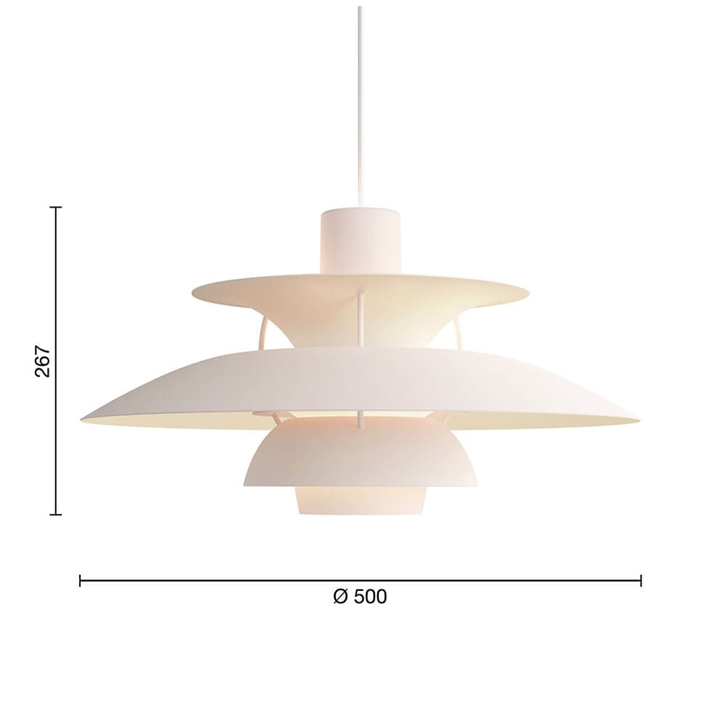 Het PH-lampnummer verwijst naar de grootte van de lampenkappen. Daarom bestaat de PH 5 hanglamp uit een bovenscherm van ca. Ø50 cm.