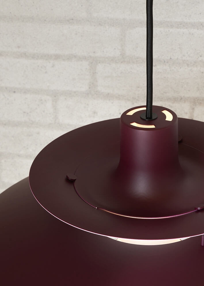 De PH 5 hanglamp is verkrijgbaar met schermen en afschermingsschermen in poedergecoat getrokken aluminium, getrokken koper of getrokken messing.