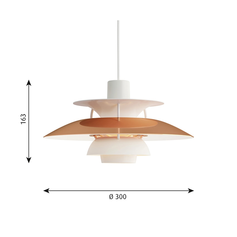 De unieke hanglamp is ongelooflijk veelzijdig en past zowel in klassieke als moderne interieurs. Deze kleinere versie van de originele PH 5 is in overeenstemming met het oorspronkelijke unieke ontwerp. De bovenste kap van de PH 5 Mini heeft een diameter van ongeveer 30 cm.