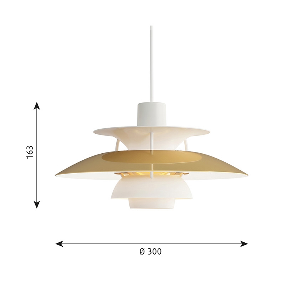 De unieke hanglamp is ongelooflijk veelzijdig en past zowel in klassieke als moderne interieurs. Deze kleinere versie van de originele PH 5 is in overeenstemming met het oorspronkelijke unieke ontwerp. De bovenste kap van de PH 5 Mini heeft een diameter van ongeveer 30 cm.