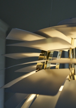 De unieke hanglamp reflecteert het licht zowel naar binnen als naar buiten, wat bijdraagt aan het fantastische licht. De bladen van de PH Artichoke in dusty green/messing zijn gemaakt van laser gesneden staal en hebben een zachte vervaagde en stoffige groene kleur met grijze ondertonen, die doen denken aan loof of verweerde steen. De bovenkap is van getrokken staal, het frame is van staal met een gemetalliseerde messing afwerking en de ophanging is van getrokken aluminium.