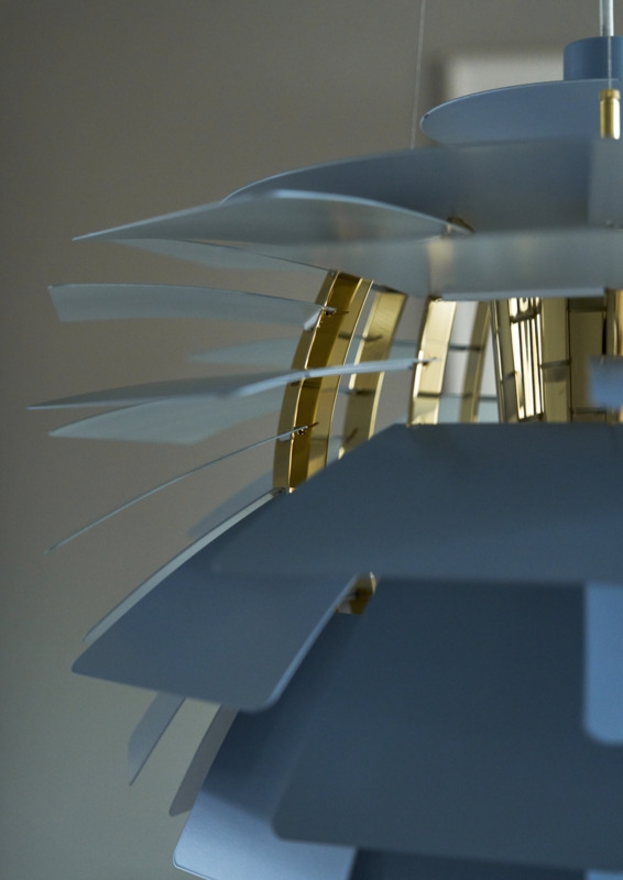 De unieke hanglamp reflecteert het licht zowel naar binnen als naar buiten, wat bijdraagt aan het uitzenden van het fantastische licht. De bladen van PH Artichoke in dusty blue/messing zijn gemaakt van lasersnijstaal en hebben een bleke en stoffige grijsblauwe kleur met koele ondertonen die rust geven aan de omgeving. De bovenkap is van getrokken staal, het frame is van staal met een gemetalliseerde messing afwerking en de ophanging is van getrokken aluminium.