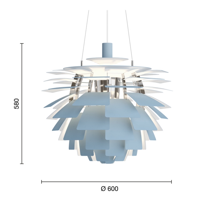De unieke hanglamp reflecteert het licht zowel naar binnen als naar buiten, wat bijdraagt aan het uitzenden van het fantastische licht. De bladen van de PH Artichoke in dusty blue/chroom zijn gemaakt van lasersnijstaal en hebben een bleke en stoffige grijsblauwe kleur met koele ondertonen, die rust geven aan de omgeving. De bovenkap is van getrokken staal, het frame is van hoogglans verchroomd staal en de ophanging is van getrokken aluminium.