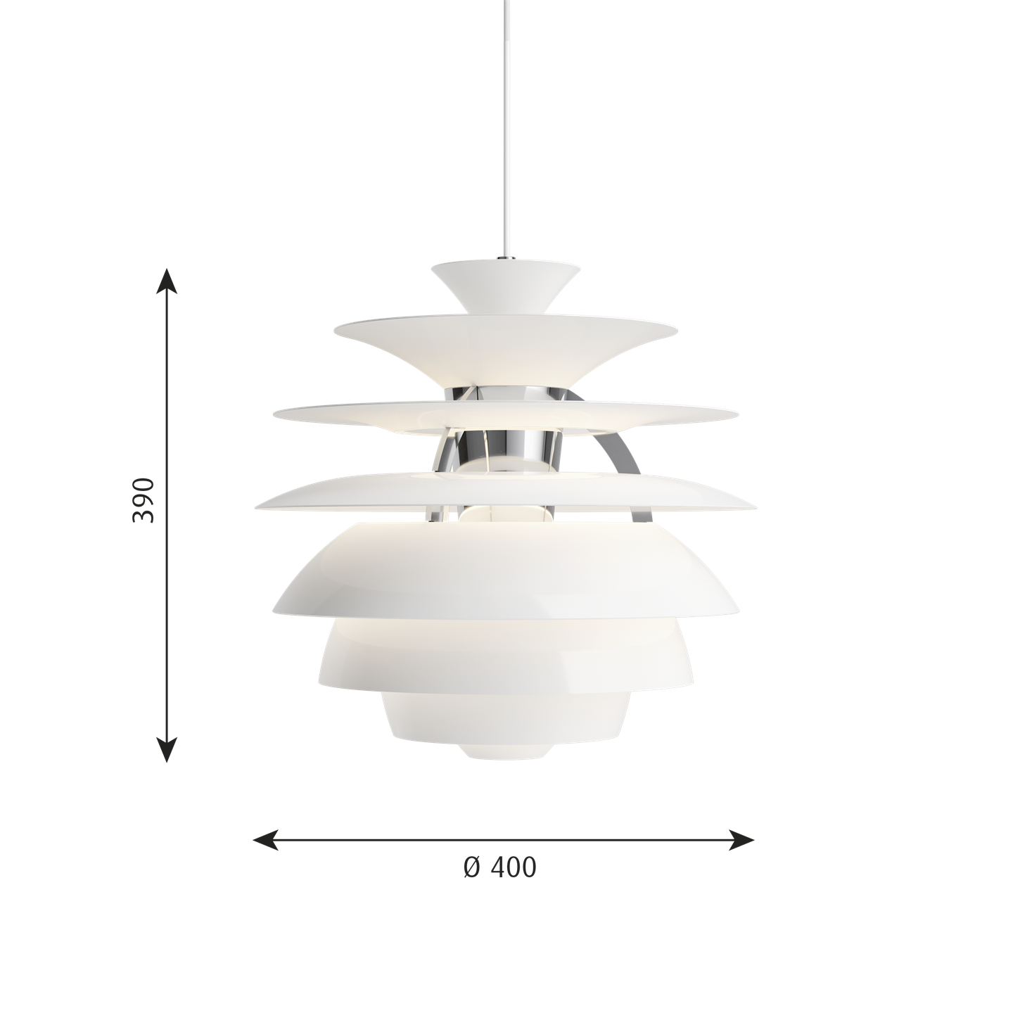 De unieke PH Snowball hanglamp biedt een zacht, harmonieus en verblindingsvrij licht, waarbij de onderste schermen het licht vasthouden in contrast met de bovenste die het licht zowel naar boven als naar beneden verspreiden. Dit geeft een prachtige gloed rondom de lamp.
