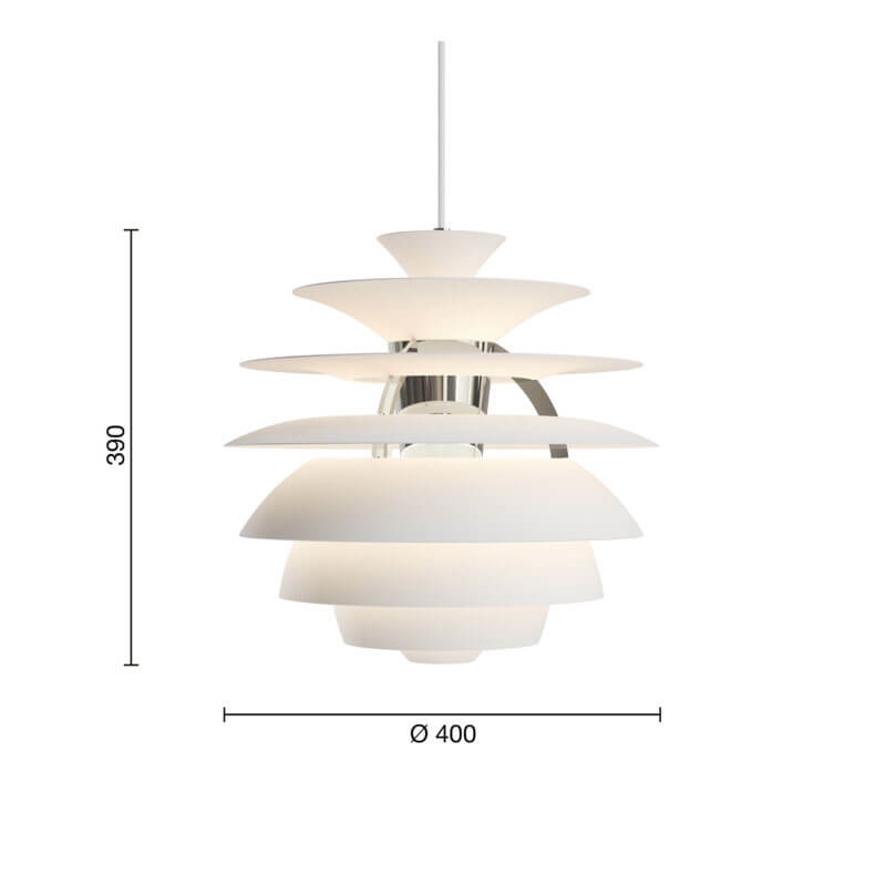 De unieke PH Snowball hanglamp biedt een zacht, harmonieus en verblindingsvrij licht, waarbij de onderste schermen het licht vasthouden in contrast met de bovenste die het licht zowel naar boven als naar beneden verspreiden. Dit geeft een prachtige gloed rondom de lamp.