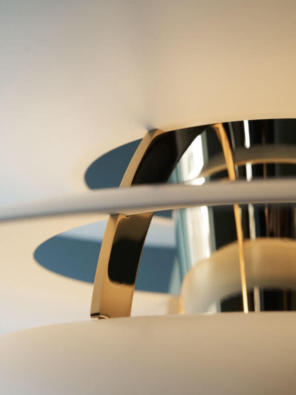 Deze PH Snowball hanglamp in soft white met matte finish gelanceerd in 2025 heeft een warmere witte tint dan de oorspronkelijke witte Snowball. De schermen zijn van poedergecoat getrokken aluminium en het frame is van aluminium met een afwerking in gepolijst gemetalliseerd messing.
