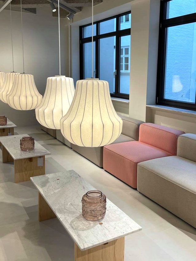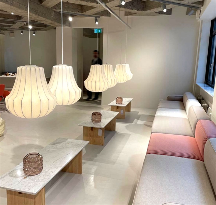 De lamp is vervaardigd door dunne draden van brandvertragende hars op een stalen frame te spuiten. Veel lagen draden voltooien de lampenkap, net zoals een zijderups zijn cocon maakt.