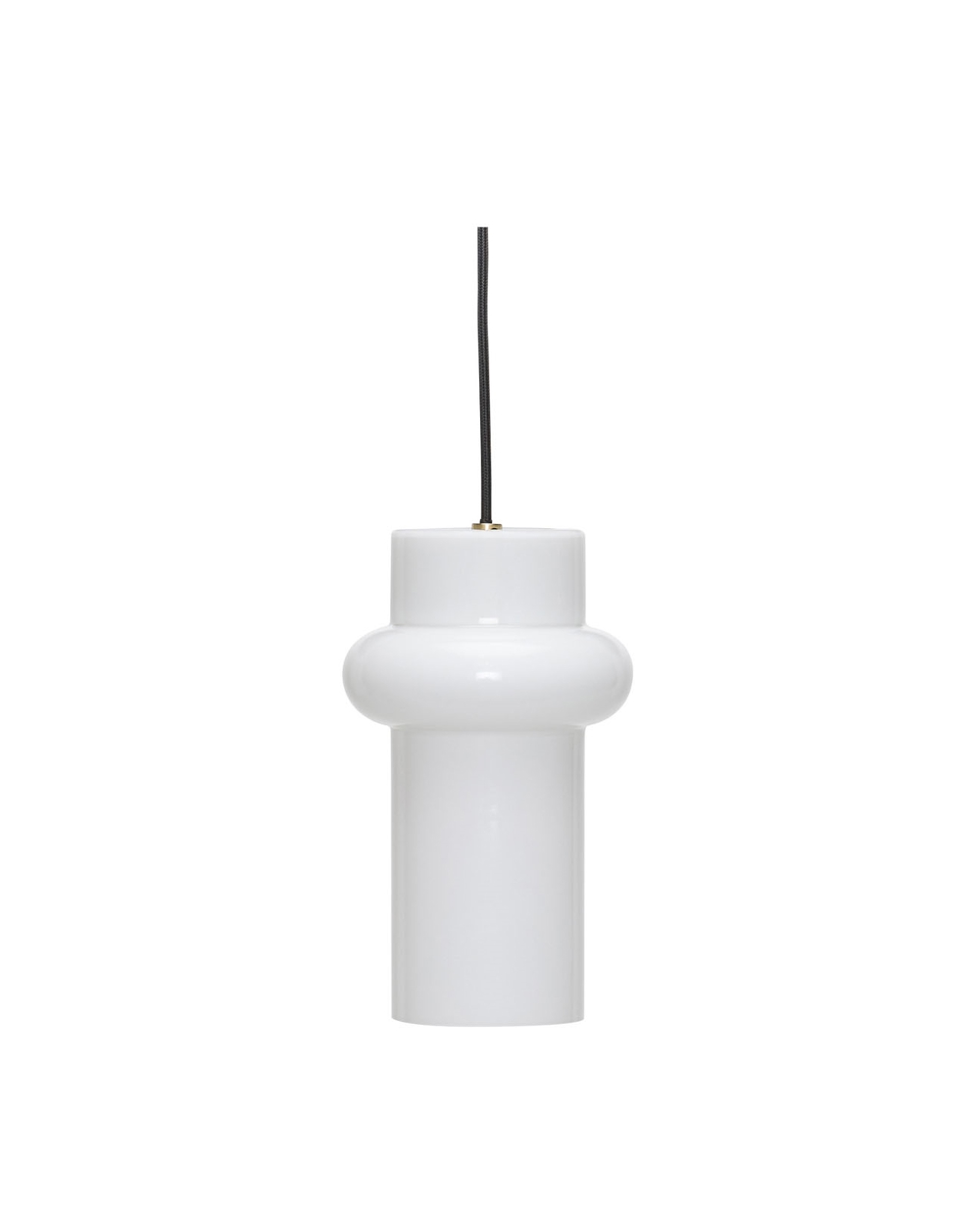 Pilule combineert een helder en eigentijds design met verwijzingen naar de vormen van de jaren '80. Deze variant met glanzende witte kap van mondgeblazen opaalglas verspreidt een aangenaam en gelijkmatig licht, terwijl fijne details in messing en het zwarte stoffen snoer karakter en contrast aan de lamp toevoegen.