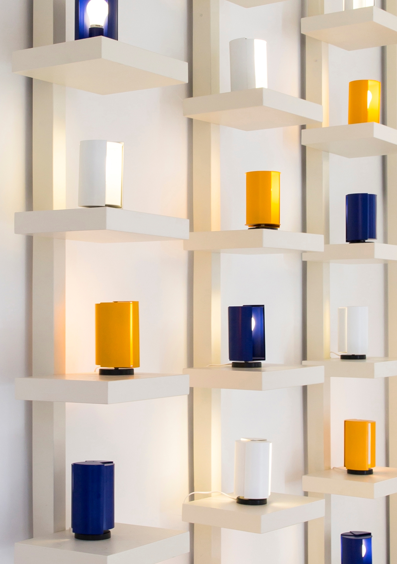 Pivotante À Poser tafellamp is een cilindervormige tafellamp met kappen van gebogen metalen platen in verschillende kleuren. De basis van de tafellamp is van mat grijs gekleurd aluminium.